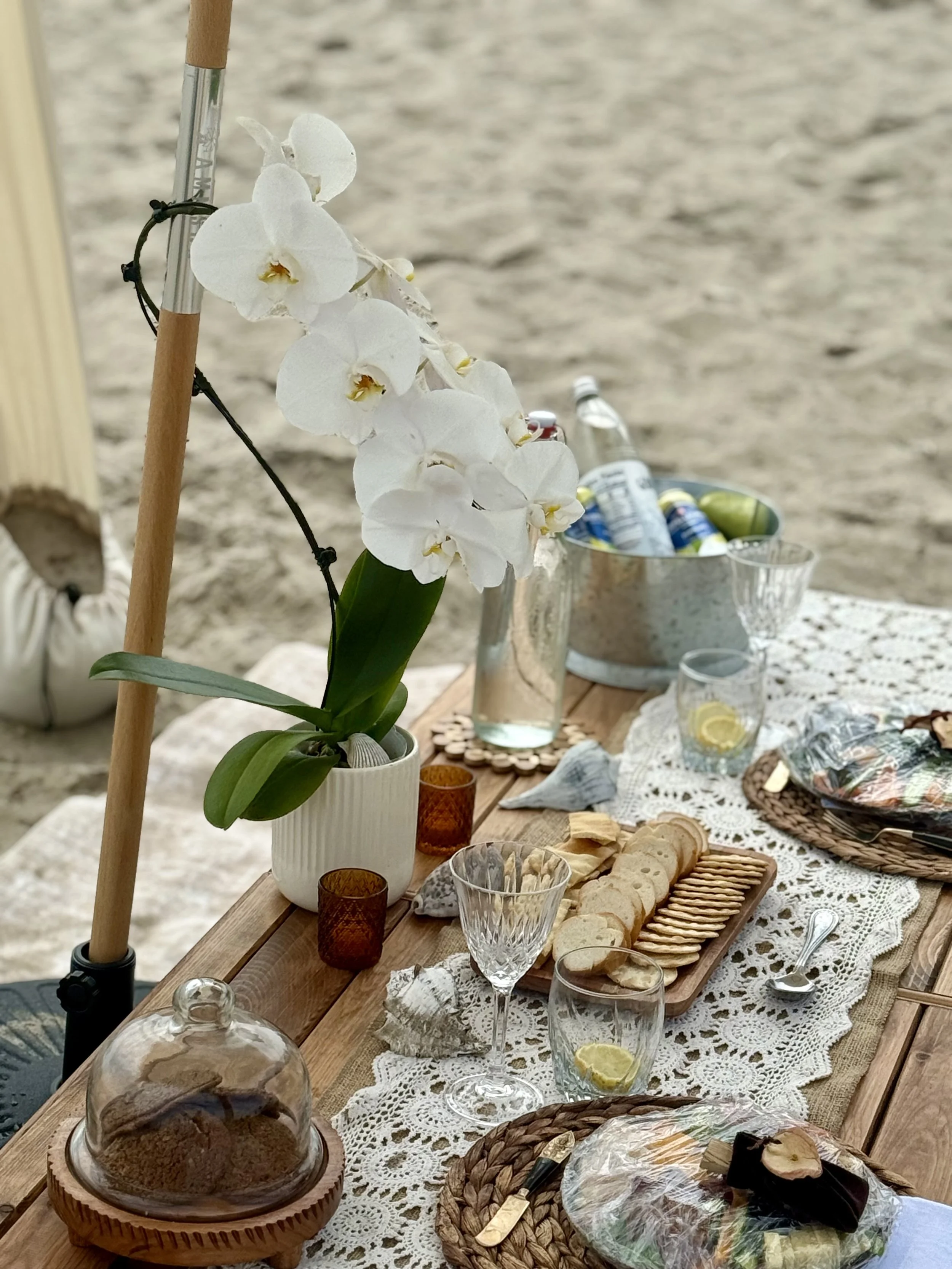 Includes: 2 hours low table, rug, pillows, plates, napkins, glass ware, flatware, chargers and umbrella.
